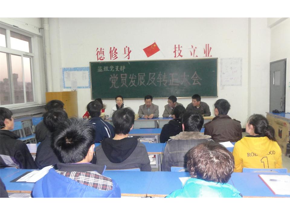 监理党支部书记史芳老师主持了大会,大会严格按照发展新党员程序进行。首先由入党申请人汇报自己对党的认识、入党动机、本人表现;入党介绍人介绍申请人主要情况;支委会向支部大会报告对申请人的政审情况;与会党员发表意见;正式党员举手表决;最后申请人表态发言。大会讨论通过了发展11名培养考察一年以上的积极分子入党的决议。支部大会还讨论了7名预备党员转正式党员的议题,同意7名预备党员的申请,转为中共正式党员。