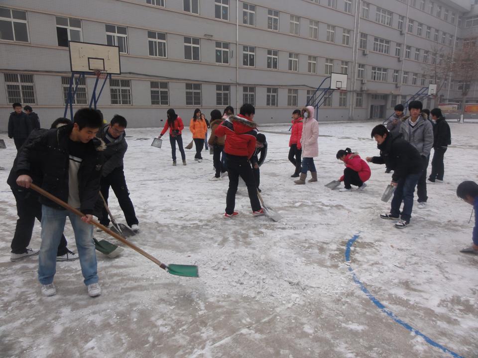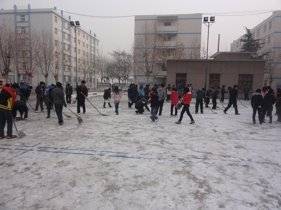 2011年元月4日中午,我系2010级获得国家助学金资助新生放弃午休,在篮球场进行了清理积雪义务劳动。