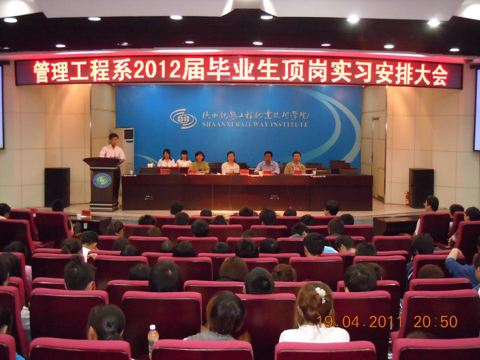 4月19日晚,管理工程系在学术报告厅召开了2012届毕业生顶岗实习安排大会。系主任刘超群副教授、党总支书记毛华东老师、物流教研室主任蔡昱老师、监理教研室主任刘四新老师、顶岗实习员工校内指导老师和实训辅导员老师以及2012届全体毕业生出席了本次大会。大会由管理工程系团总支书记马少雄老师主持。