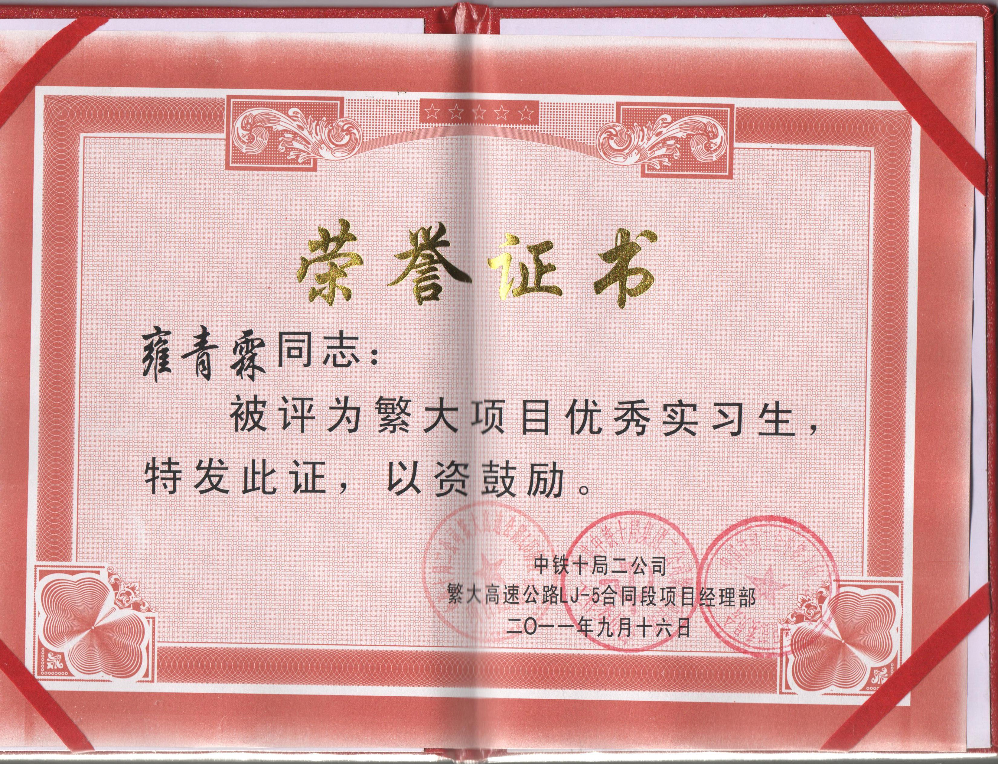 管理工程系物流3092班员工雍青林近期被评为中铁十局二公司繁大项目部优秀实习生(见附图)。据了解,该生在现场实习期间,能较快适应环境,发扬“拼搏争先、吃苦奉献”的德信体育官网精神。认真完成各项顶岗实习任务。该生此次被评为优秀实习生,为我系赢得了荣誉。全系员工都应向雍青林学习,增强责任心,提高理论同现场实践结合的能力。增强自身就业能力。为我系和公司争光。