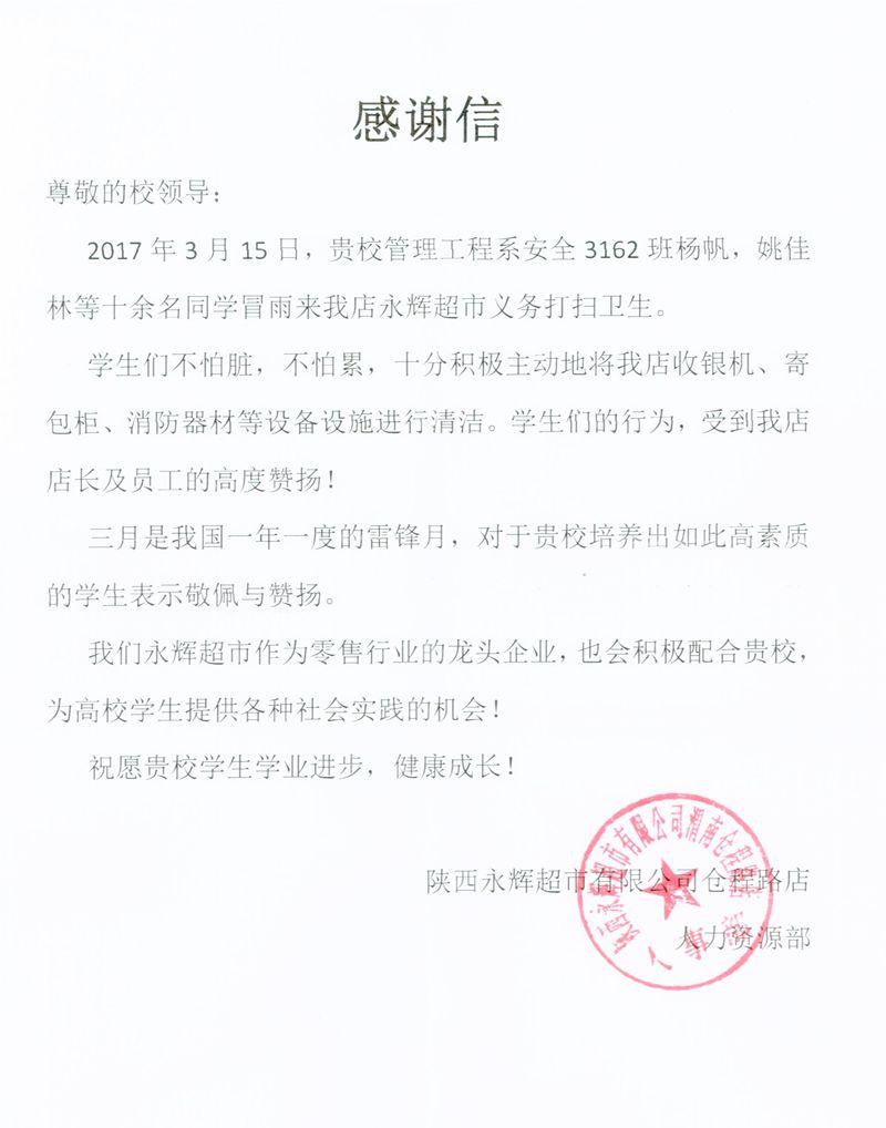 3月15日,在提前与渭南市永辉超市沟通协调的情况下,同学们以团支部为单位,利用午休时间前往超市进行义务大扫除活动。到达超市后,在团支部书记的分配下同学们分成三组进行打扫,一组同学打扫超市储物柜,另一组擦洗超市消防器材,剩余一组打扫超市收银台,整个过程同学们分工明确,积极主动。而打扫期间同学们表现出来的不怕脏、不怕苦的精神,受到超市员工的一致好评。