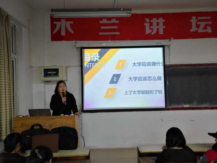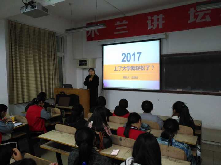 12月6日晚,由管理系女生部主办的本学期第二期“木兰讲坛”在公司临渭区B106教室成功举办,本次活动以“上了大学就轻松了吗?”为主题,活动特别邀请到了心理健康教育中心的吕泊怡老师作为主讲,2017级各班女生代表参加此次活动。