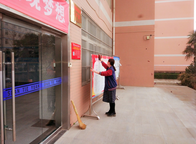 员工党员擦拭宣传栏