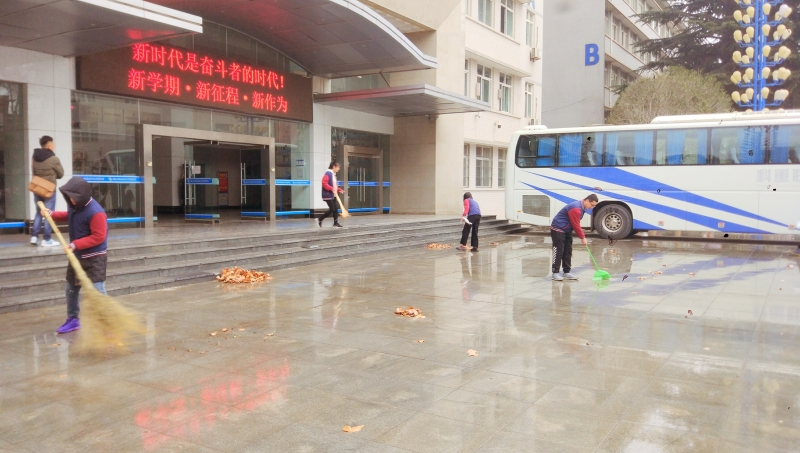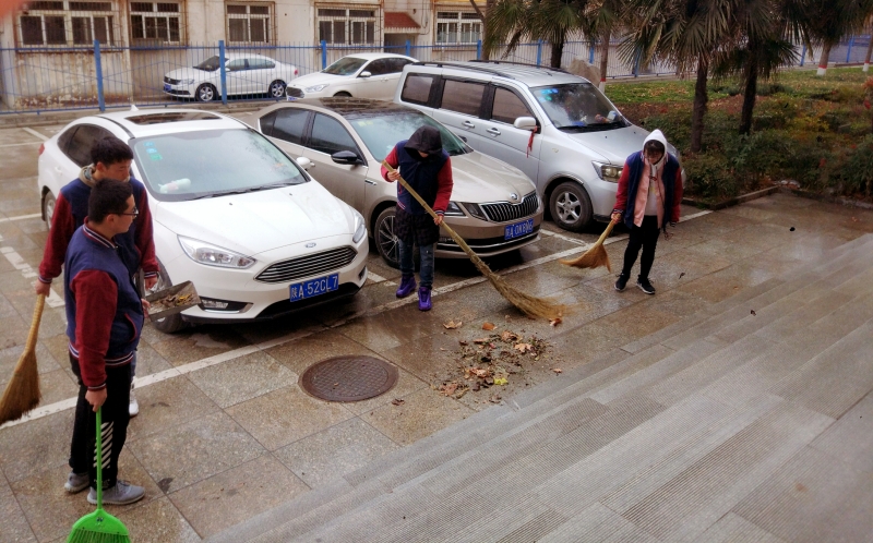 员工党员清扫党员责任区实训楼门前地面