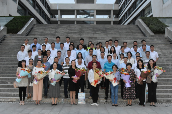 全体人员合影,管理工程系史芳老师(左二)、张欣老师(左四)、蔡昱老师(右一)被员工赠与鲜花。