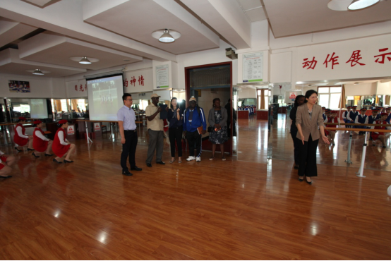 蔡昱老师带领参观形体训练室,并向肯尼亚来宾展示了“礼仪操”,来宾们表示对“礼仪操“很感兴趣。
