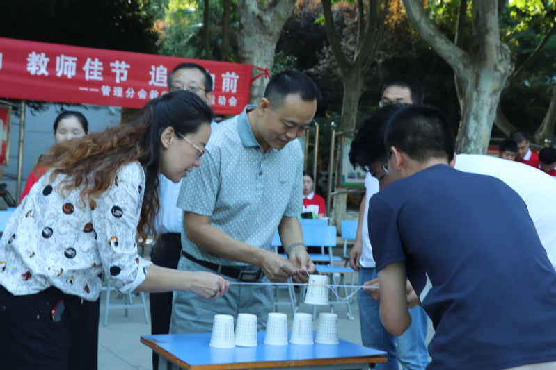首先是游戏环节——“鼓动人心”、“毽子接力”、“水瓶翻翻乐”等趣味游戏,使每一名老师参与其中,玩在其中,乐在其中,场下的同学们情绪高涨,热情洋溢的为每一名老师加油喝彩。