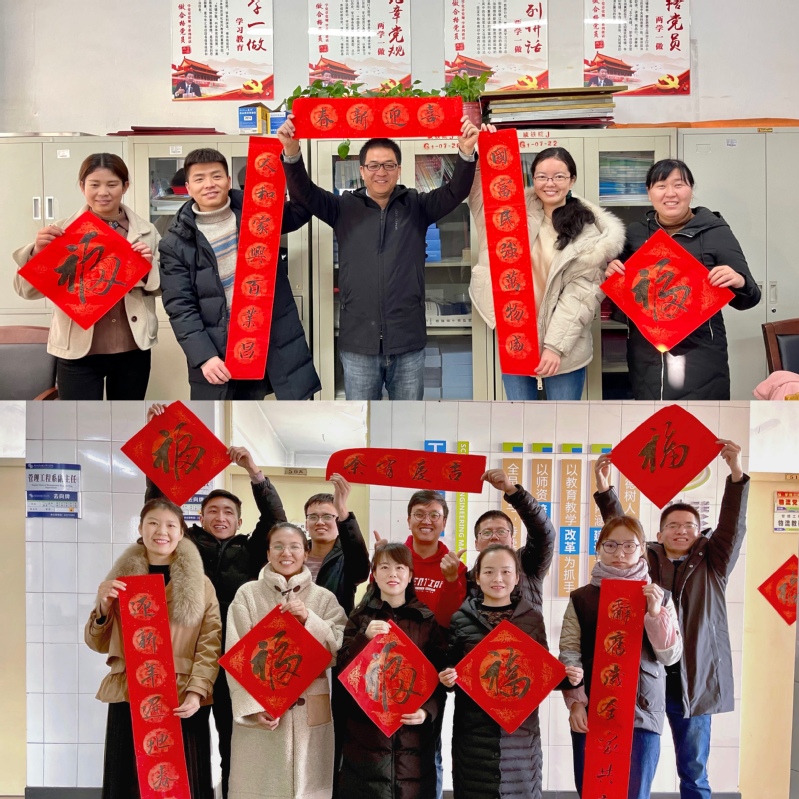 活动现场,党总支书记郗春荣为大家送上了一幅幅春联,一张张福字,也送上了一句句的祝福。“人和家兴百姓昌,国富民强万物盛”、“园丁辛苦一庭秀,桃李芬芳四海春”……春联既有挥别鼠年、喜迎牛年辞旧迎新的美好愿景,也有平安吉祥、和谐发展的励志高歌。