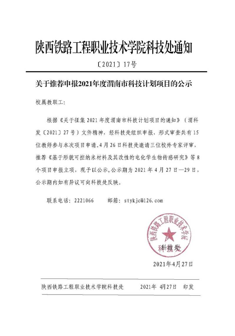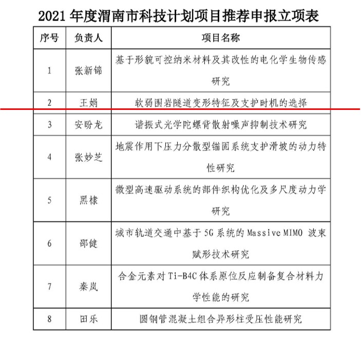根据《关于征集2021年度渭南市科技计划项目的通知》(渭科发〔2021〕27号)文件精神,经科技处组织申报、形式审查、邀请校外专家评审,科技处近日公示了推荐立项的8个项目,公司王娟老师的《软弱围岩隧道变形特征及支护时机的选择》课题项目成功入选!
