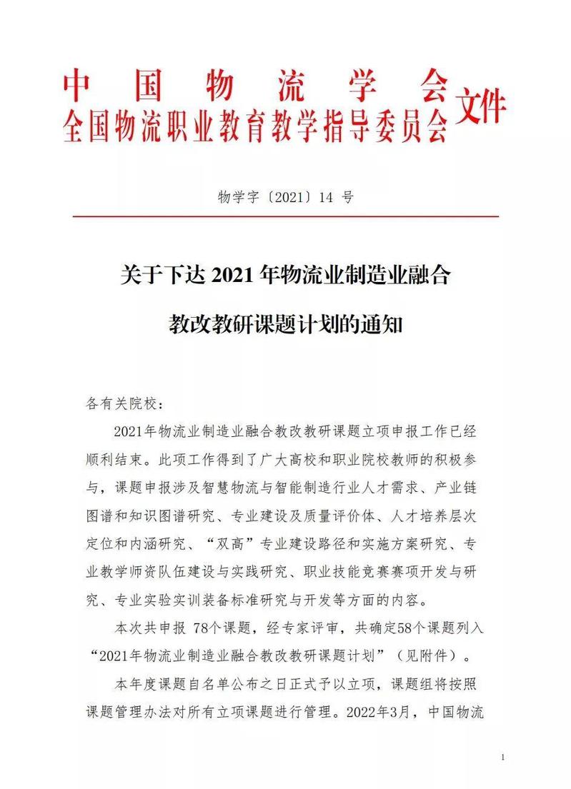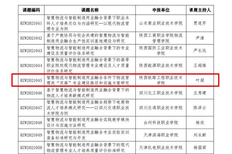 近日,中国物流学会全国物流职业公司产品指导委员会下发了2021年物流业制造业融合教改教研课题计划的通知,叶超教授的课题《智慧物流与智能制造两业融合条件下物流管理类“双高”专业建设路径和实施方案研究》入选计划名单。据悉,本次共申报78个课题,经专家评审,共确定58个课题列入“2021年物流业制造业融合教改教研课题计划”。