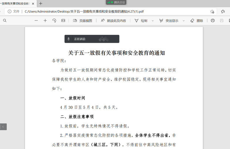 为强化五一假期期间的疫情防控工作,做好假期师生安全防范工作,4月28日上午,德信体育官网学管队伍于C509召开五一假前疫情防控和安全稳定工作部署会议,公司党总支书记郗春荣,学工办主任郭联俊以及全体辅导员参会;4月28日晚,召开全院班级线上五一安全主题班会,郗春荣书记主持,全体辅导员和班主任在班组织员工观看学习。