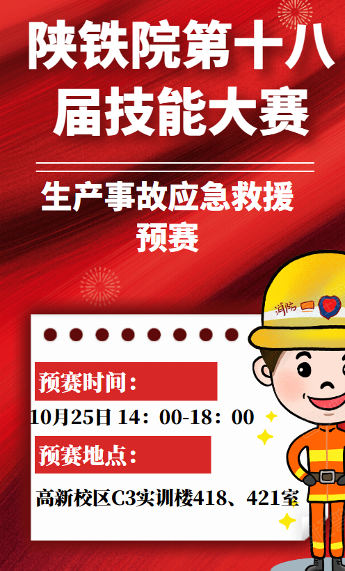 公司第18届技能大赛——生产事故应急救援预赛 即将开赛:预赛时间:10月25日14:00-18:00。预赛地点:高新校区C3实训楼418、421室。(肖亚军)