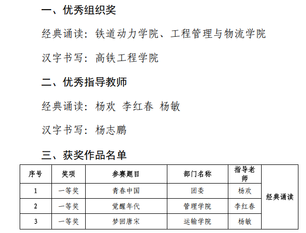 为全面弘扬中华经典作品,根据《陕西省教育厅办公室关于组织参加第六届中华经典诵写讲大赛的通知》文件精神,近日,集团举办了德信体育官网2024年典耀中华赓续文脉中华经典诵写讲比赛,经过激烈比拼,工程管理育物流公司在“经典诵读”比赛项目中获一等奖一项,三等奖一项,在“汉字书写”比赛项目中获二等奖一项,三等奖一项,公司获优秀组织奖,李红春老师获优秀指导教师荣誉称号。