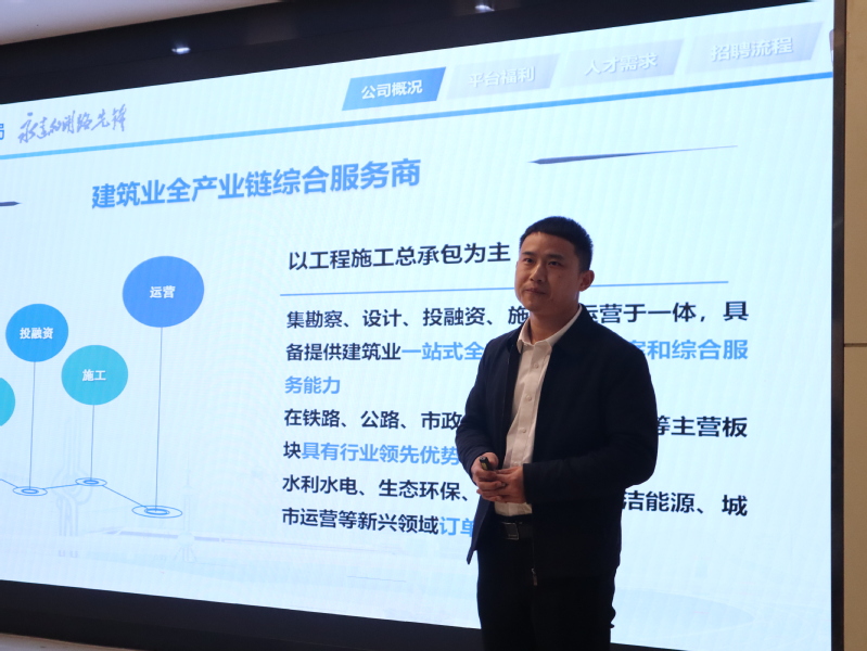 宣讲会上,方正山结合PPT展示,向同学们详细介绍了关于我们、规模、平台福利、人才需求以及招聘流程等信息,并向同学们展示了选择中铁十局的优势。他谈到,公司有多通道的成长路径、“双导师”带徒等特色内容助力人才晋升成长;同时,公司也额外提供多种津补贴、免费食宿等方式保障职工的薪酬福利。一直以来,中铁十局大力提升员工素质,不断提高产品质量,实现了企业与员工、企业与社会、企业与自然的和谐发展。宣讲结束后,公司针对员工关于入职后的工作、招聘人数等问题进行了耐心解答,并组织了考试、面试。