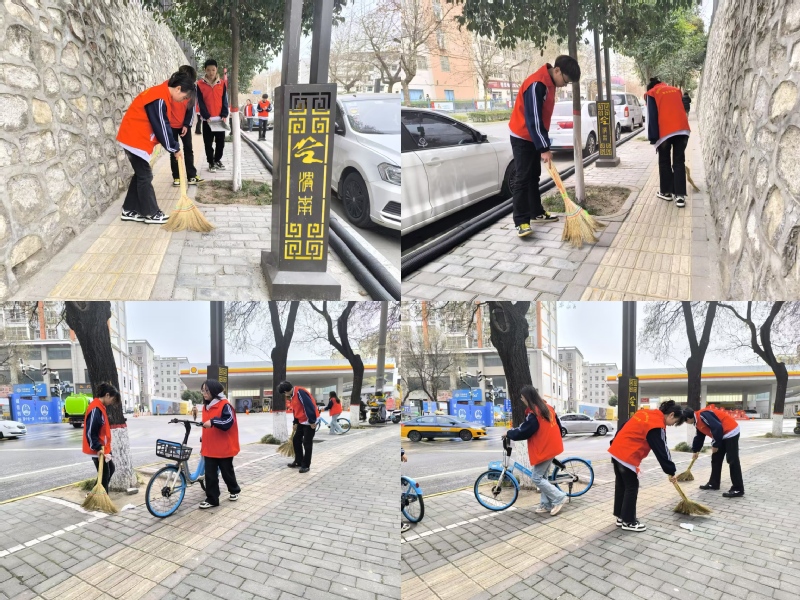 员工志愿者们身着统一的志愿服装,携带扫帚、簸箕、抹布等清洁工具来到站南街道。大家兵分两路,一组重点清理盲道上的杂物、垃圾和障碍物,确保盲人朋友出行安全顺畅。另一组志愿者则负责整理乱停乱放的共享单车,将街边随意停放的自行车有序摆放在指定区域,并对车身进行简单擦拭。