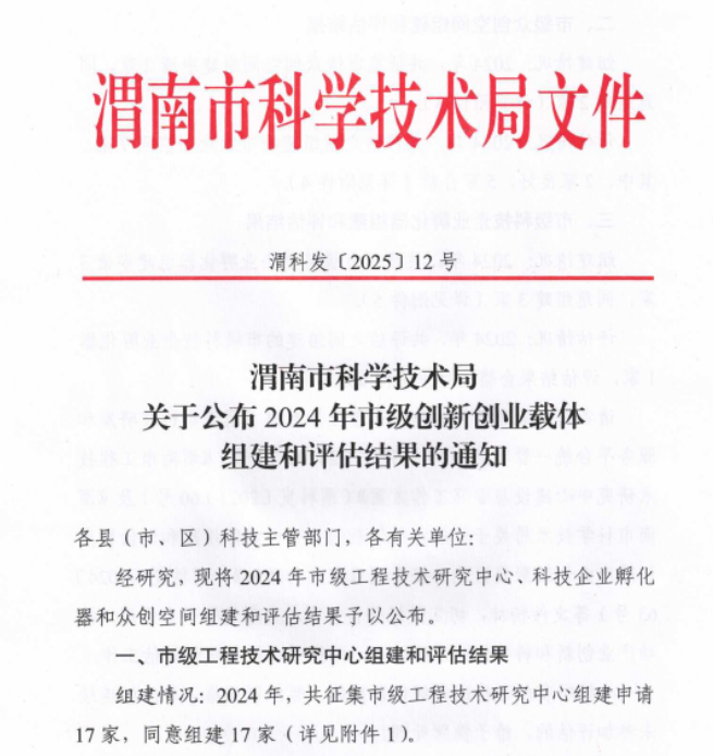 6月5日,渭南市科学技术局下发《关于公布2024年市级创新创业载体组建和评估结果的通知》(渭科发〔2025〕12号),经过院部申报、公司推荐、科技局实地考察,公司推荐的6个中心(全市17个)全部入选组建名单,入选数量在全市企事业单位、科研院所中位居第一。